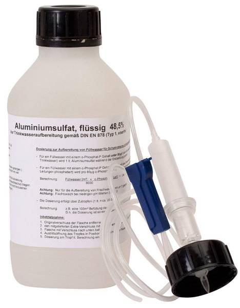 - WM Aluminiumsulfatlösung ist nur für die Aufbereitung von Leitungswasser geeignet! Denn dieses wird vom Wasserversorger auf einen pH-Wert von rund 7 eingestellt. Natürliche Gewässer und auch Schwimmteiche weisen jedoch in der Regel einen höheren pH-Wert von 8,4 auf. Bei diesen pH-Wert funktioniert die Phosphatfällung nicht, da das Aluminium sofort als Aluminiumoxid ausfällt.